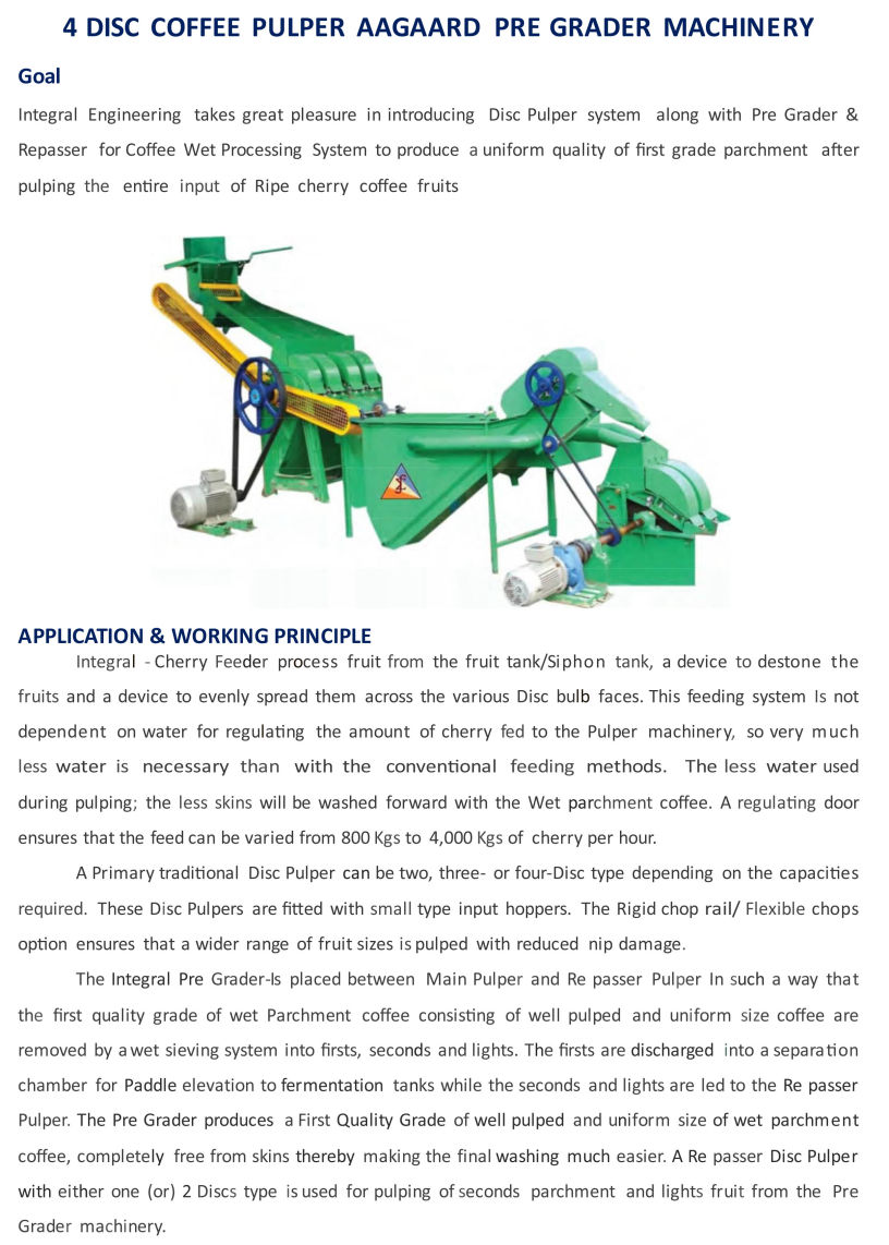 Integral Engineering takes great pleasure in introducing Disc Pulper system along with PreGrader & Repasser for Coffee Wet Processing System to produce a uniform quality of first grade parchment after pulping the entire input of ripe cherry coffee fruits.