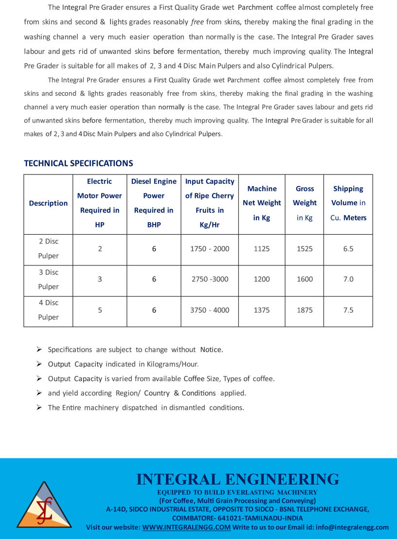 The Integral Pre Grader ensures a First Quality Grade wet Parchment coffee almost completely free from skins and second & lights grades reasonably free from skins,thereby making the final grading in the washing channel a very much easier operation than normally is the case.The Integral Pre Grader saves labour and gets rid of unwanted skins before fermentation, thereby much improving quality. The Integral Pre Grader is suitable for all makes of 2, 3 and 4 Disc Main Pulpers and also Cylindrical Pulpers.